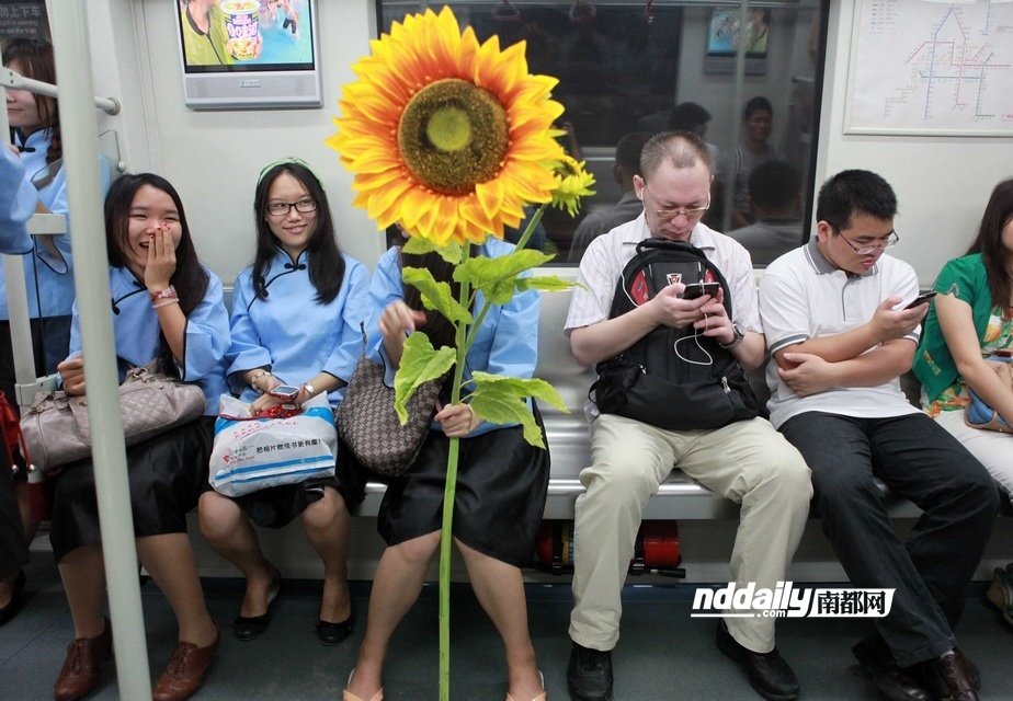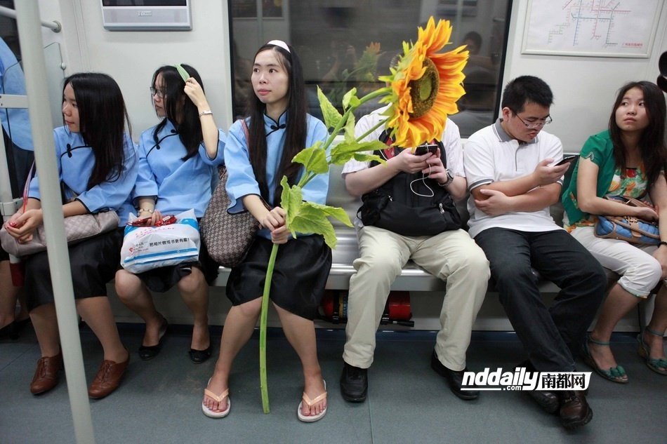 6月27日上午,身穿复古中山装的中大毕业生坐地铁前往中大南校区拍毕业照,其中一个学生手持向日葵花做道具。