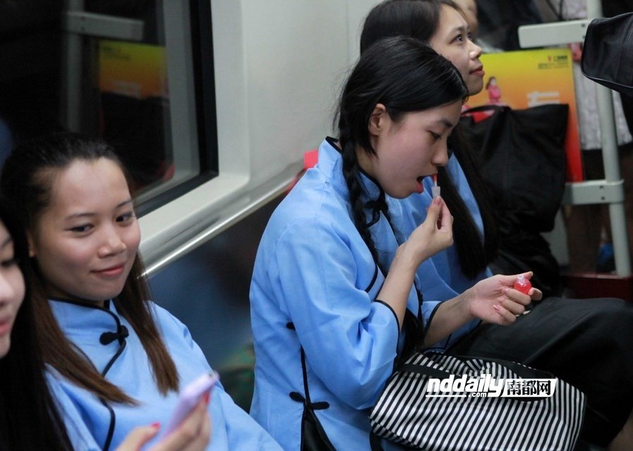 6月27日上午,身穿复古中山装的中大毕业生坐地铁前往中大南校区拍毕业照,其中一个学生在路上补妆。