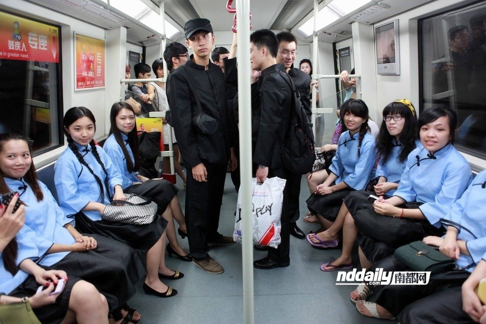 昨日上午9时许,一群穿着复古中山装的年轻人出现在地铁八号线车厢内,引得不少乘客围观拍照。这群年轻人是中山大学大学城校区的毕业生,为延续中大学生穿中山装拍摄毕业照的传统,他们一大早就在大学城内“变装”,然后搭乘地铁前往中大本部。车厢内,扎着两个小辫、忙着补妆的学生小艾激动地说:“不拍中山装毕业照,不是中大的学生。”南都记者钟丽婷 冯宙锋 实习生 张冬梅 摄影报道