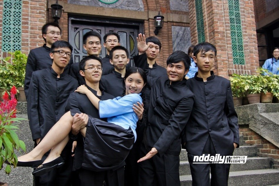 6月27日,中山大学部分学生穿着复古中山装拍毕业照,一名女生被男生抱起。